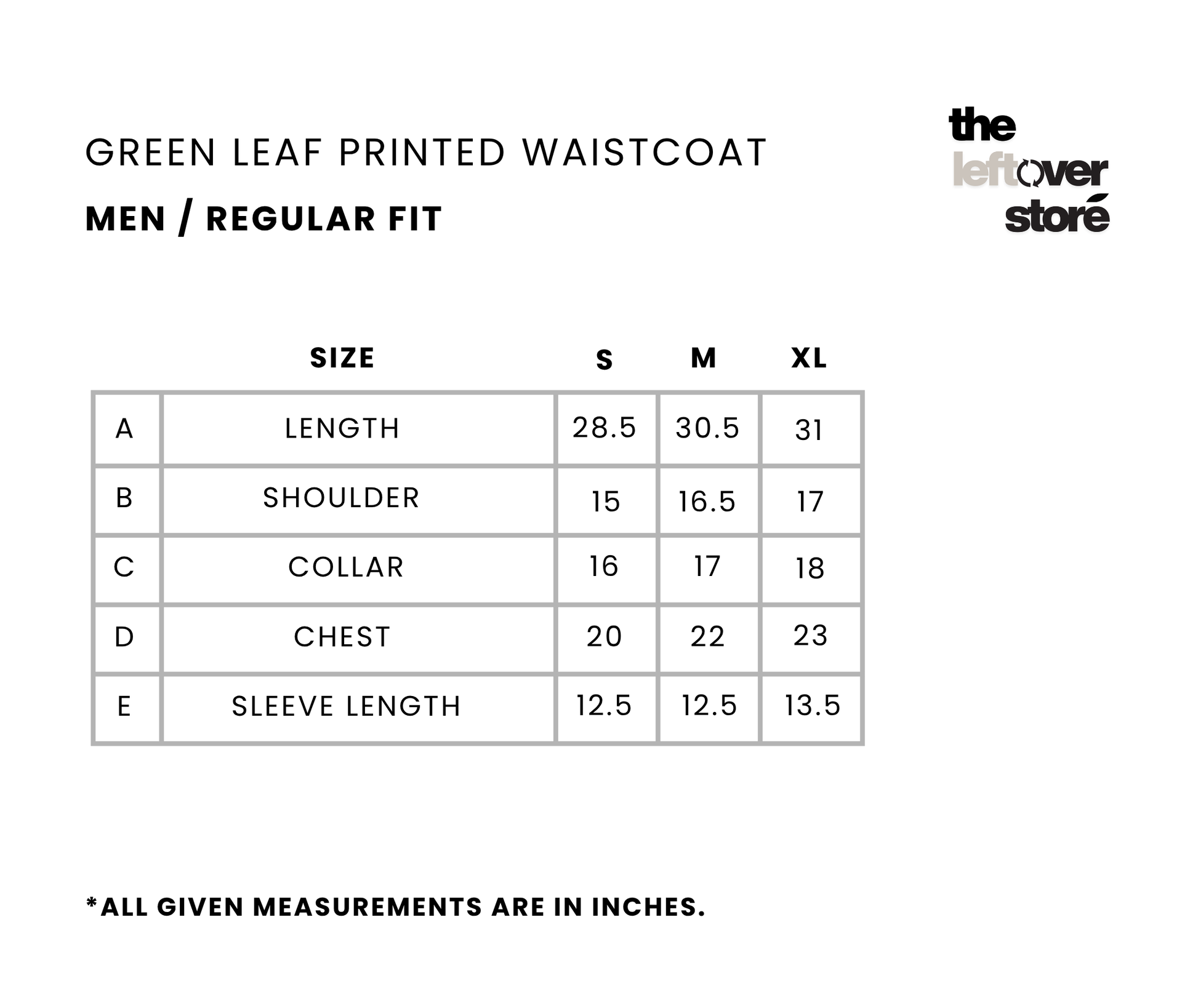 Add a touch of nature-inspired elegance to your outfit with the Green Leaf Printed Waistcoat. This waistcoat features an intricate golden leaf print on a deep green fabric, creating a rich and sophisticated look. The unique asymmetric front design with a side-button closure and a clean mandarin collar makes it a standout piece for any celebratory event.